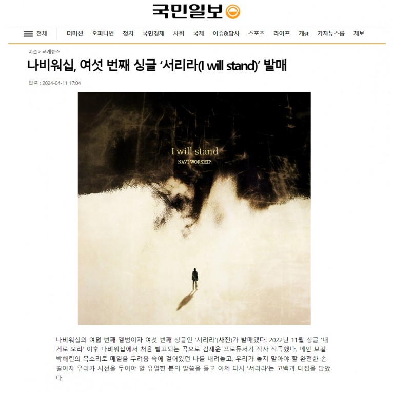 [기사] 나비워십, 여섯 번째 싱글 ‘서리라(I will stand)’ 발매(국민일보)