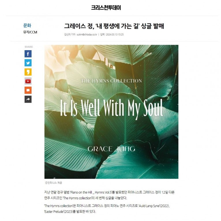 [기사] 그레이스 정, ‘내 평생에 가는 길’ 싱글 발매(크리스천투데이)