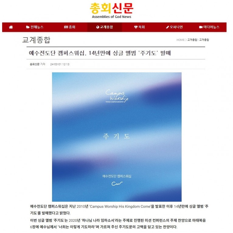 [기사] 예수전도단 캠퍼스워십, 14년만에 싱글 앨범 '주기도' 발매(총회신문)