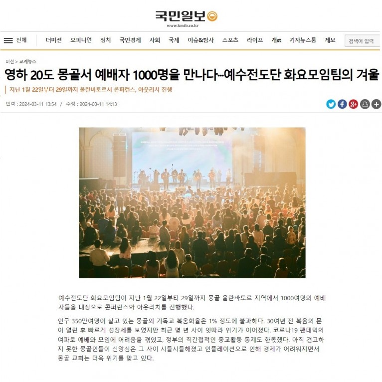 뮤직타임 [기사_인터뷰] 영하 20도 몽골서 예배자 1000명을 만나다···예수전도단 화요모임팀의 겨울(국민일보)