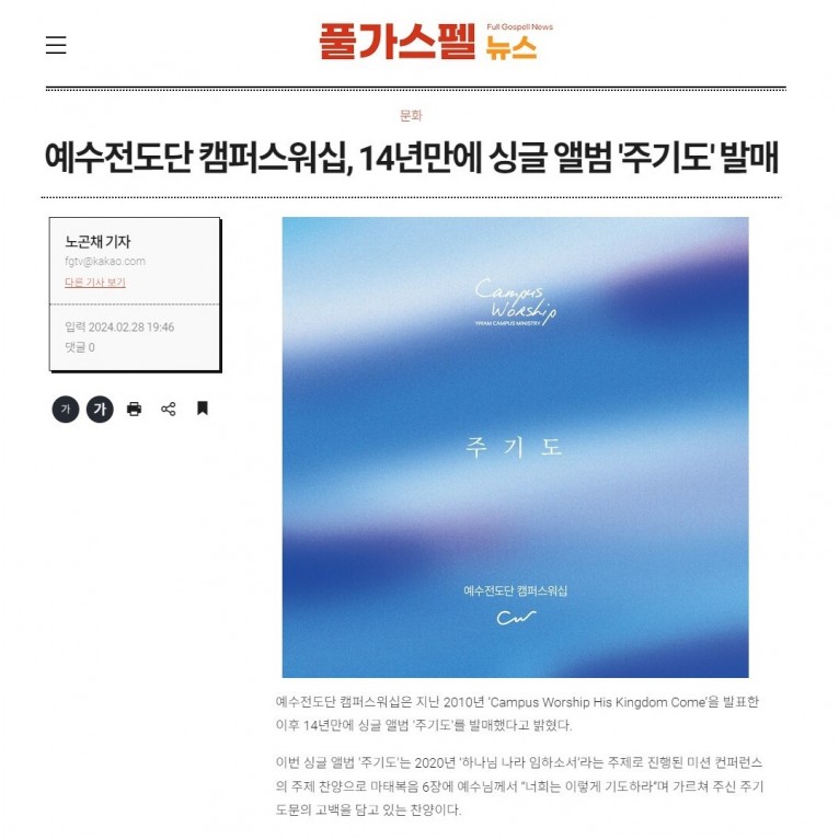 [기사] 예수전도단 캠퍼스워십, 14년만에 싱글 앨범 '주기도' 발매(풀가스펠뉴스)