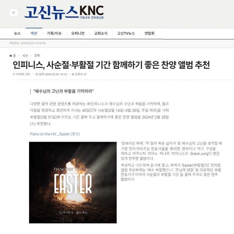 다양한 음악 관련 콘텐츠를 제공하는 ㈜인피니스가 예수님의 수난과 죽음을 기억하며, 몸과 마음을 정결하고 경건하게 지내는 40일간의 사순절(2월 14일~3월 30일, 주일 제외)을 거쳐 부활절(3월 31일)에 이르는 기간 곁에 두고 함께하기에 좋은 찬양 앨범을 2024년 2월 28일(수) 추천했다.