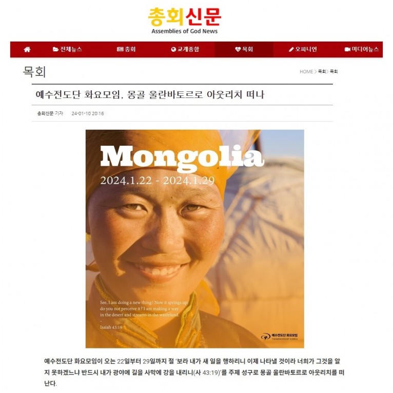 뮤직타임 [기사] 예수전도단 화요모임, 몽골 울란바토르로 아웃리치 떠나(총회신문)