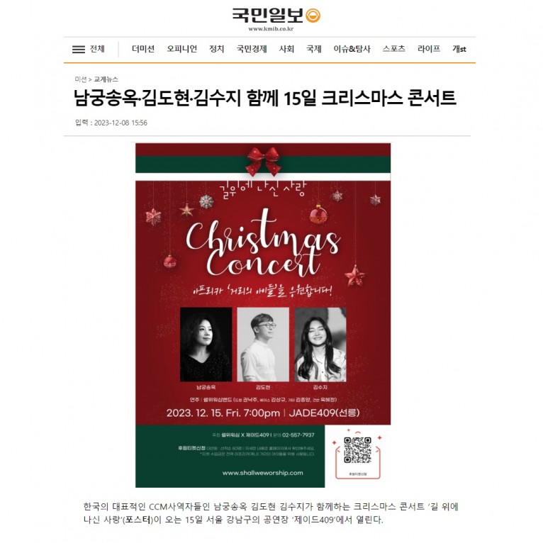 [기사] 남궁송옥·김도현·김수지 함께 15일 크리스마스 콘서트(국민일보)
