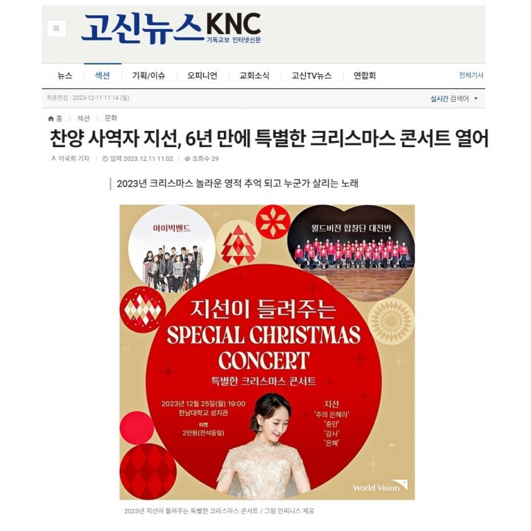 [기사] 찬양 사역자 지선, 6년 만에 특별한 크리스마스 콘서트 열어(고신뉴스 KNC)