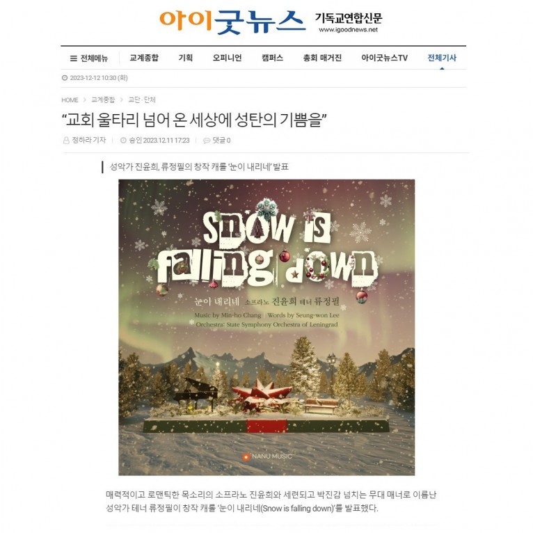 뮤직타임 [기사] “교회 울타리 넘어 온 세상에 성탄의 기쁨을”(아이굿뉴스 기독교연합신문)
