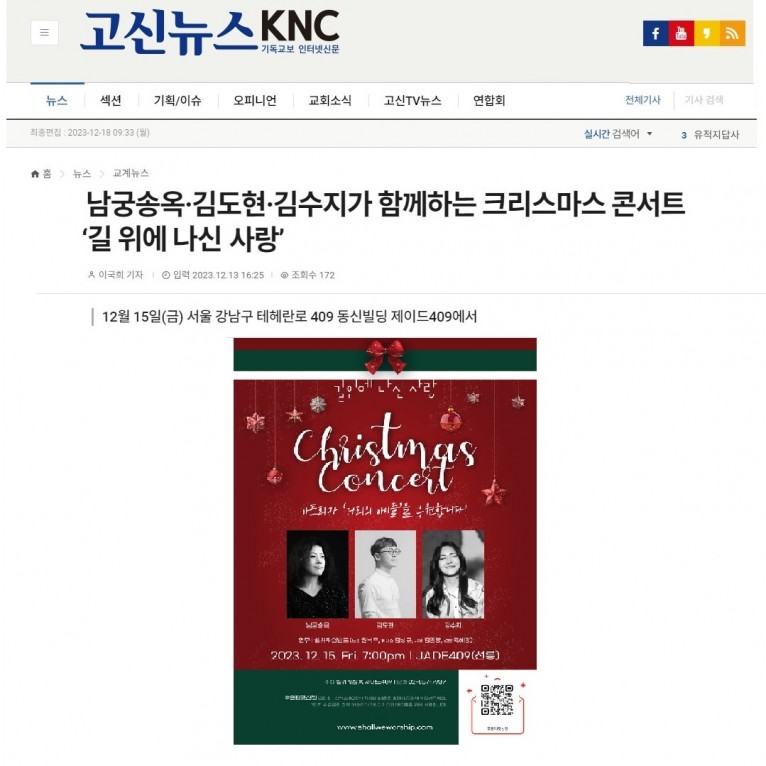 [기사] 남궁송옥·김도현·김수지가 함께하는 크리스마스 콘서트 ‘길 위에 나신 사랑’(고신뉴스 KNC)