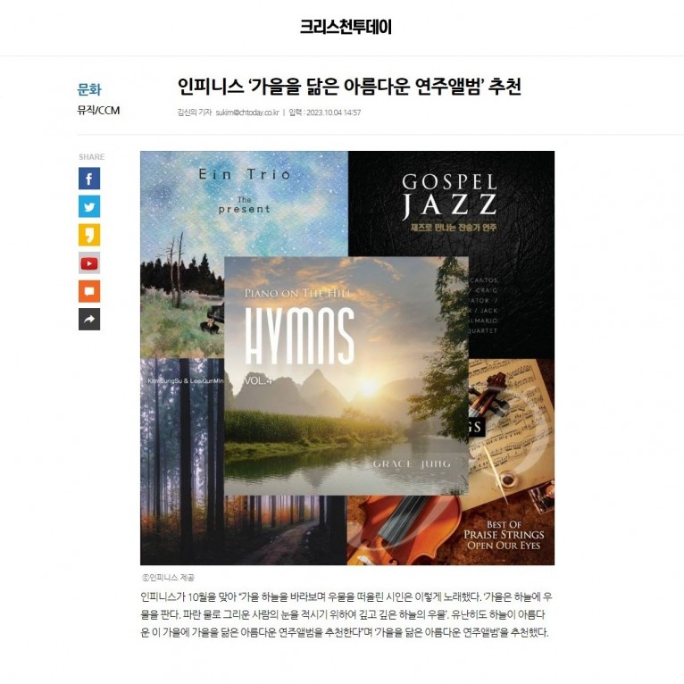 인피니스가 추천한 앨범은 Piano on the Hill의 Hymns Vol.4(음원)과 아인트리오(Ein Trio)의 The Present(CD)(음원), 재즈로 만나는 찬송가 연주(Gospel Jazz)(2CD), 김성수 & 이건민의 Into The Woods(CD)(음원), Maranatha Music의 Best of Praise Strings (CD)다.