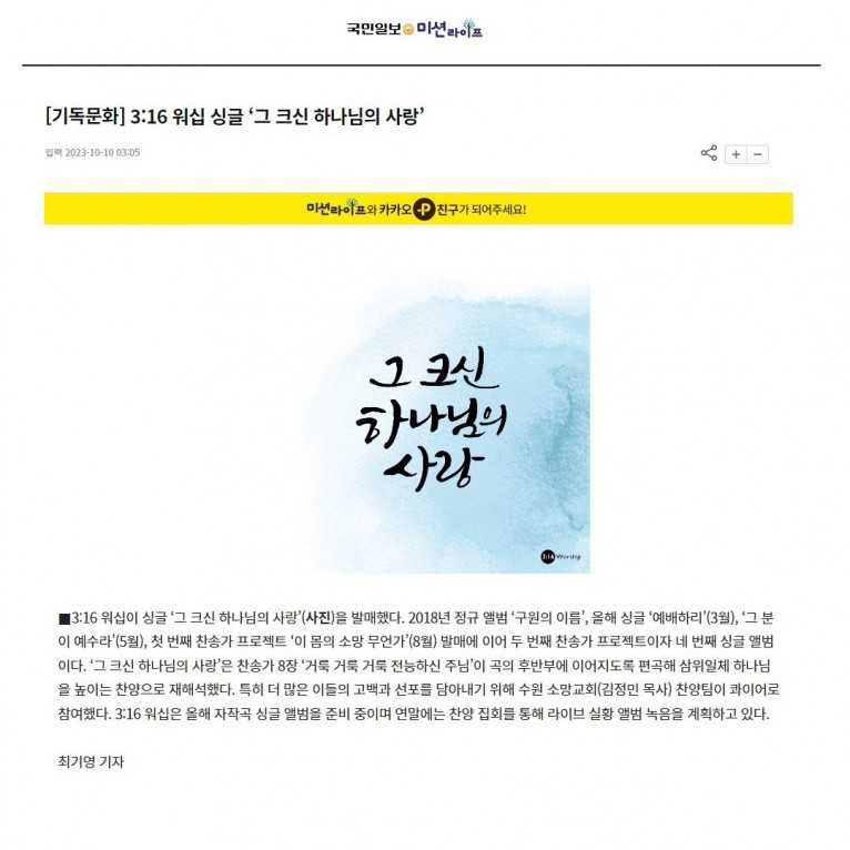 [기사] 3:16 워십 싱글 ‘그 크신 하나님의 사랑’(국민일보)