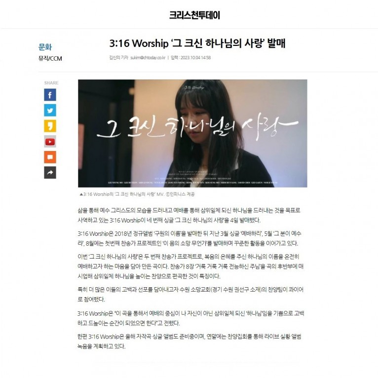 [기사] 3:16 Worship ‘그 크신 하나님의 사랑’ 발매(크리스천투데이)