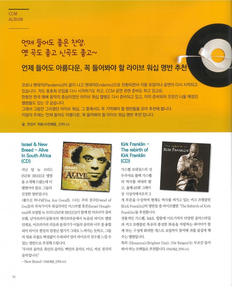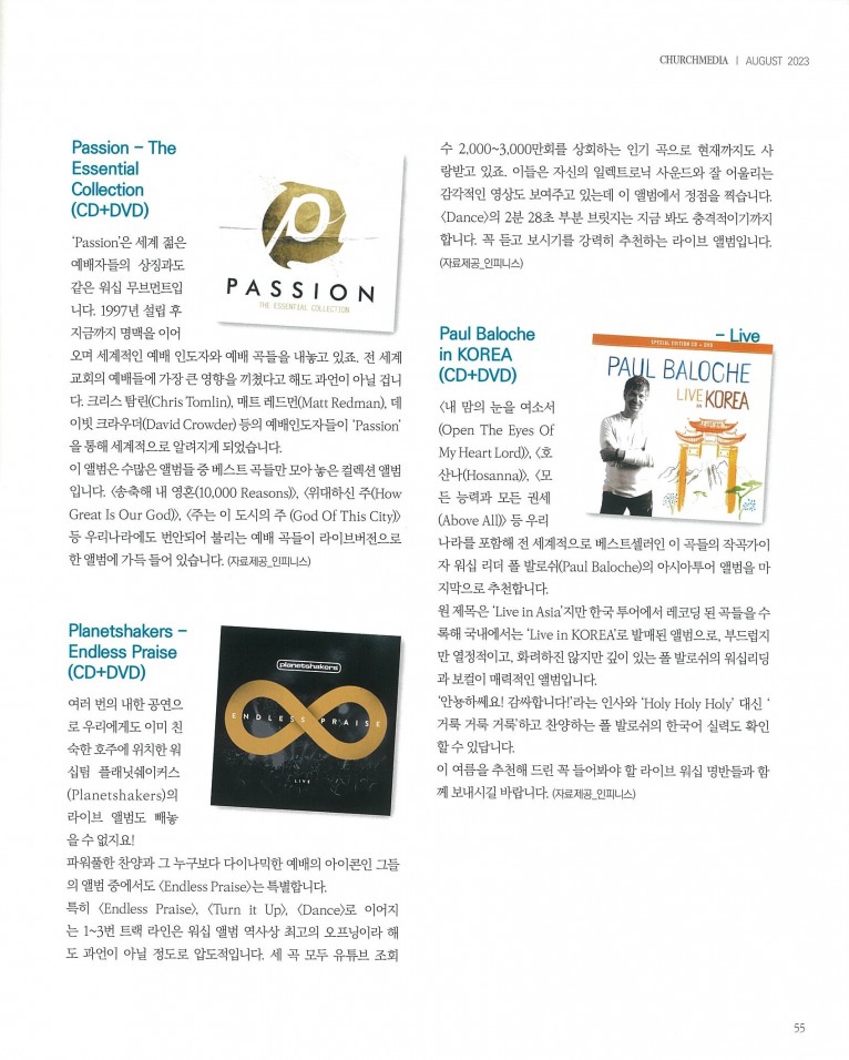 [잡지] 언제 들어도 아름다운, 꼭 들어봐야 할 라이브 워십 명반 추천(월간 Church Media 8월호)