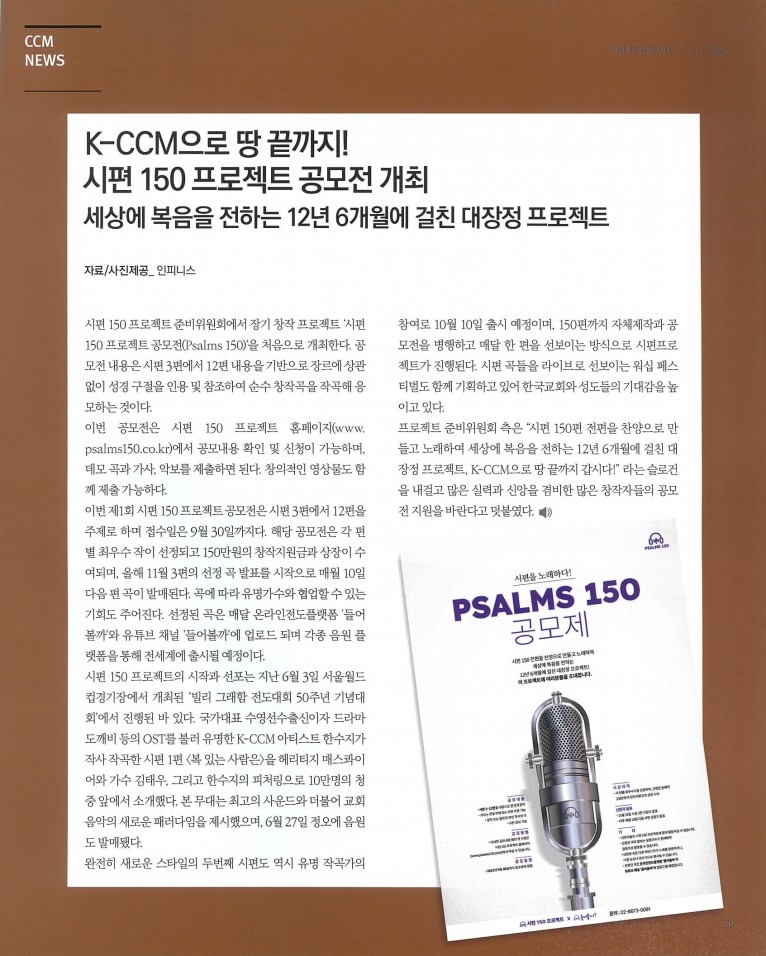 [잡지] K-CCM 으로 땅 끝까지! 시편 150 프로젝트 공모전 개최, 세상에 복음을 전하는 12년 6개월에 걸친 대장정 프로젝트(월간 Church Media 7월호)