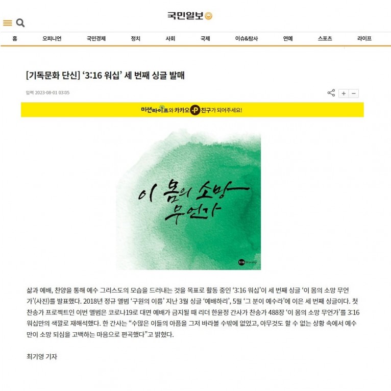 [기사] ‘3:16 워십’ 세 번째 싱글 발매(국민일보)