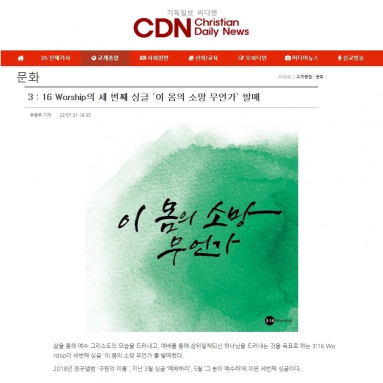 [기사] 3:16 Worship의 세 번째 싱글 '이 몸의 소망 무언가' 발매(기독일보 씨디엔)