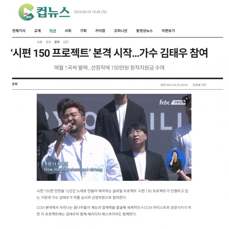 뮤직타임 [기사] ‘시편 150 프로젝트’ 본격 시작…가수 김태우 참여(크리스챤연합신문)