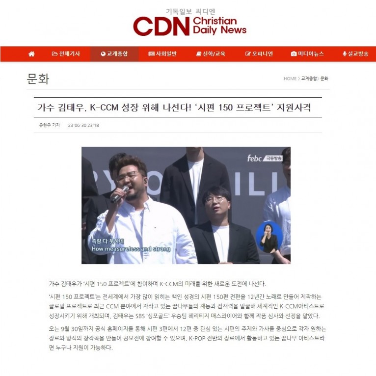 뮤직타임 [기사] 가수 김태우, K-CCM 성장 위해 나선다! ‘시편 150 프로젝트’ 지원사격(기독일보 씨디엔)