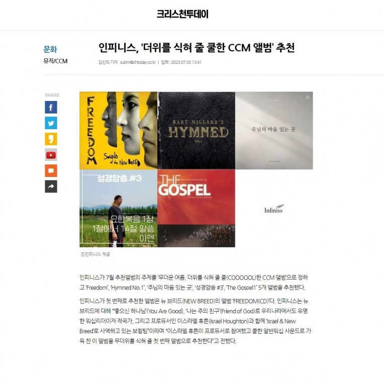 인피니스가 7월 추천앨범의 주제를 ‘무더운 여름, 더위를 식혀 줄 쿨(COOOOOL)한 CCM 앨범’으로 정하고 ‘Freedom’, ‘Hymned No.1’, ‘주님의 마음 있는 곳’, ‘성경암쏭 #3’, ‘The Gospel1’ 5개 앨범을 추천했다.