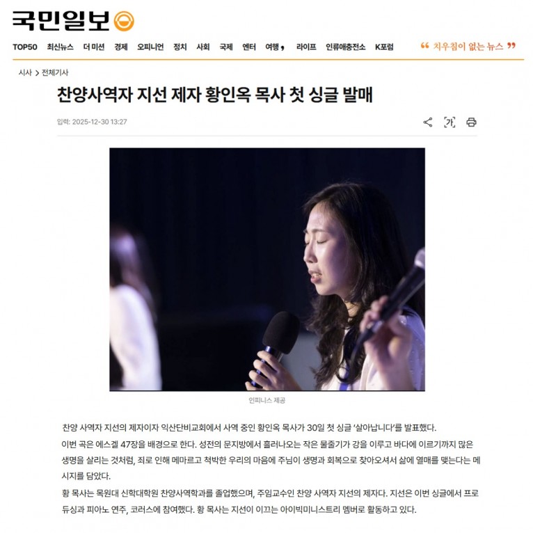[기사] 찬양사역자 지선 제자 황인옥 목사 첫 싱글 발매(국민일보)