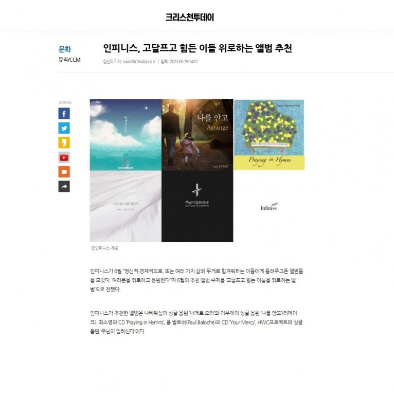 인피니스가 추천한 앨범은 나비워십의 싱글 음원 ‘내게로 오라’와 이우해의 싱글 음원 ‘나를 안고’(리메이크), 최소영의 CD ‘Praying in Hymns’, 폴 발로쉬(Paul Baloche)의 CD ‘Your Mercy’, HWC프로젝트의 싱글 음원 ‘주님이 일하신다’이다.