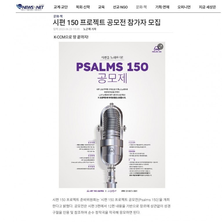 뮤직타임 [기사] 시편 150 프로젝트 공모전 참가자 모집(뉴스앤넷)