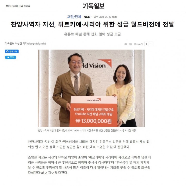 [기사] 찬양사역자 지선, 튀르키예·시리아 위한 성금 월드비전에 전달(기독일보)