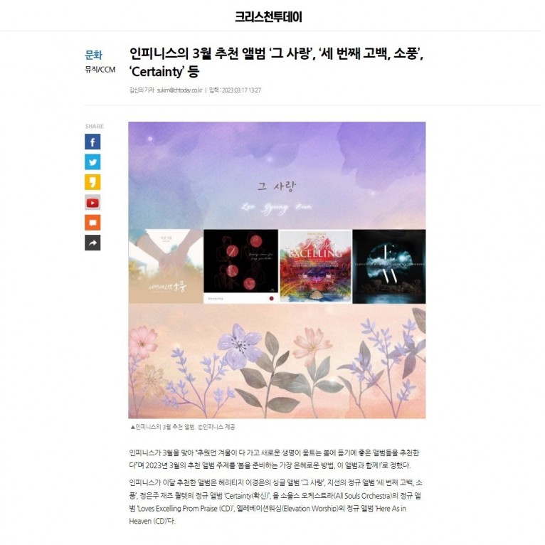 인피니스가 3월을 맞아 “추웠던 겨울이 다 가고 새로운 생명이 움트는 봄에 듣기에 좋은 앨범들을 추천한다”며 2023년 3월의 추천 앨범 주제를 ‘봄을 준비하는 가장 은혜로운 방법, 이 앨범과 함께!’로 정했다.
