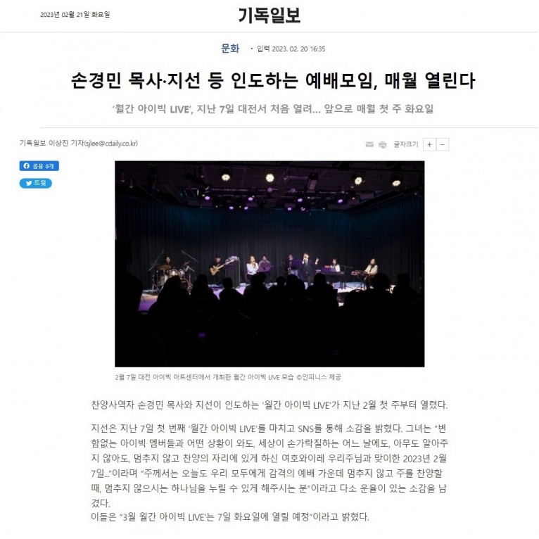 뮤직타임 [기사] 손경민 목사·지선 등 인도하는 예배모임, 매월 열린다(기독일보)