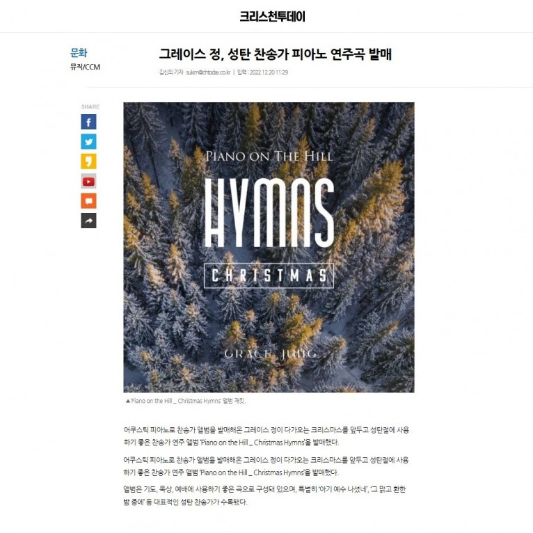 어쿠스틱 피아노로 찬송가 앨범을 발매해온 그레이스 정이 다가오는 크리스마스를 앞두고 성탄절에 사용하기 좋은 찬송가 연주 앨범 ‘Piano on the Hill _ Christmas Hymns’을 발매했다.
