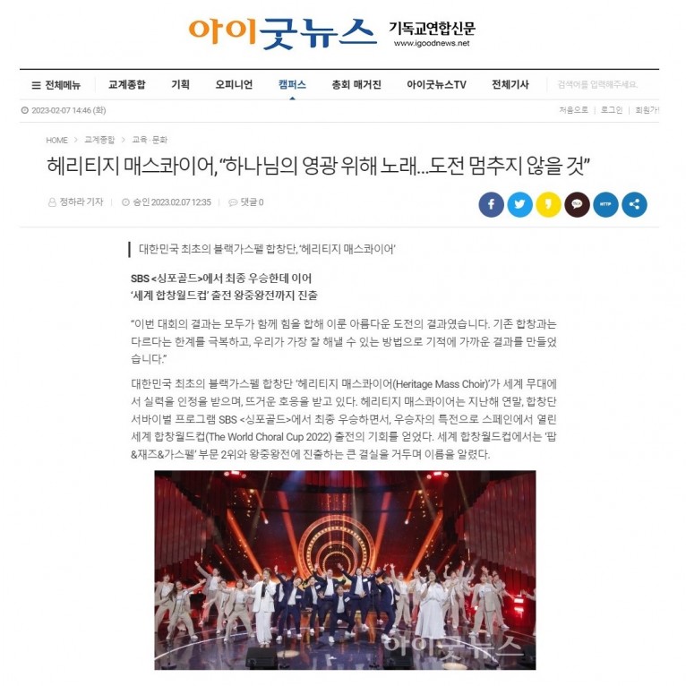 [기사] 헤리티지 매스콰이어, “하나님의 영광 위해 노래…도전 멈추지 않을 것”