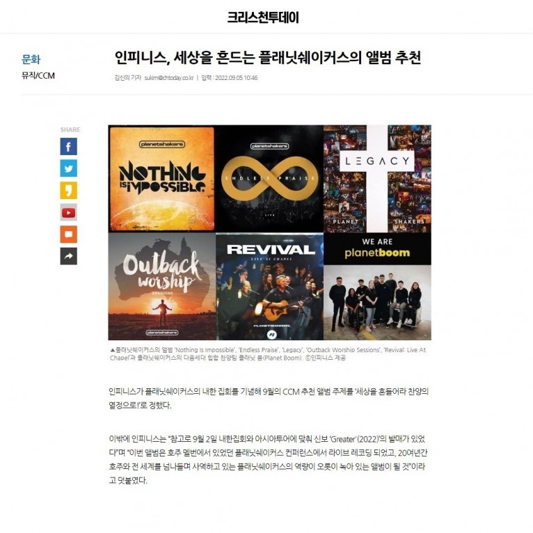 “9월 2일 내한집회와 아시아투어에 맞춰 신보 ‘Greater'(2022)’의 발매가 있었다”며 “이번 앨범은 호주 멜번에서 있었던 플래닛쉐이커스 컨퍼런스에서 라이브 레코딩 되었고, 20여년간 호주와 전 세계를 넘나들며 사역하고 있는 플래닛쉐이커스의 역량이 오롯이 녹아 있는 앨범이 될 것”이라고 덧붙였다.
