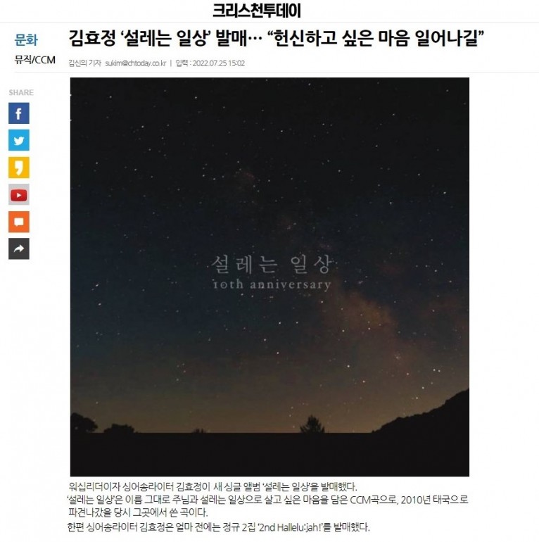 [기사] 김효정 ‘설레는 일상’ 발매… “헌신하고 싶은 마음 일어나길”