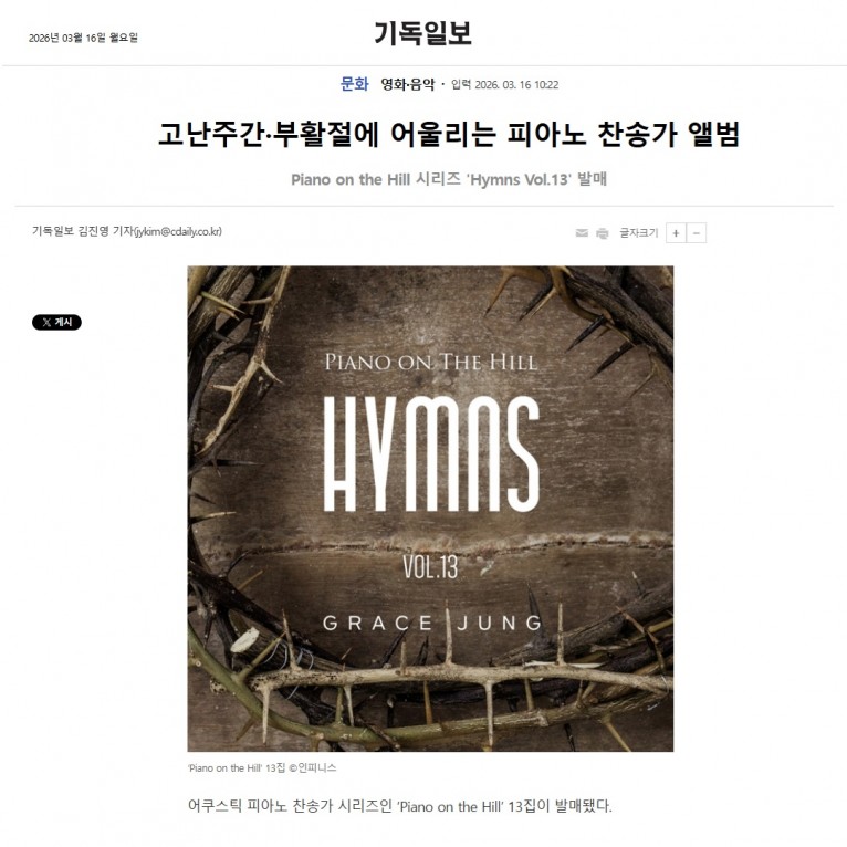 뮤직타임 [기사] 고난주간·부활절에 어울리는 피아노 찬송가 앨범(기독일보)