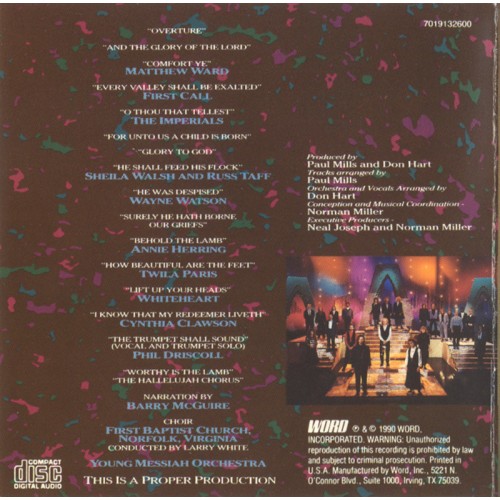 크로스 오버의 획기적인 음반. 새롭게 옛 고전 헨델의 메시아를 현대적으로 contemporary화 해서 재편곡해서 대거 유명 아티스트들이 현대적으로 메시아를 부름. 옛 고전 오케스트레이션과 현대적 악기와의 접목 또한 빼놓을 수 없는 획기적인 시도. 샌디 패티, 수잔 애쉬톤, 신디 모건, 트라일라 패리스, 스티븐 커티스 채프만, 칼멘, 스트븐 그린, 마이클 잉글리쉬 등이 참여. First call의 아카펠라 곡과 샌디 패티와 스티븐 커티스 채프만의 듀엣, 여러 아티스트들과 브룩클린 터버너클 합창단이 함께하는 할렐루야 곡등 신선함을 만끽할 수 있는 명반.